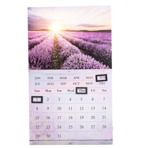 Nástěnný kalendář se třemi magnetickými okénky, které zobrazují aktuální měsíc a den. Kalendář je zdoben oblíbeným motivem levandule. Materiál: plátno na dřevěném rámu. Rozměry: 30 x 50x 2 cm