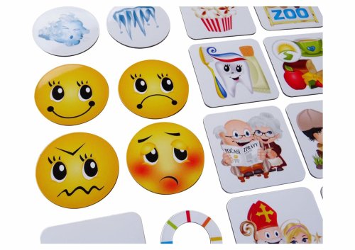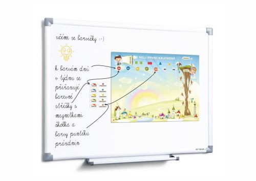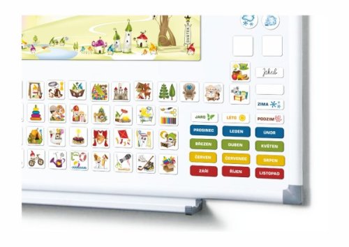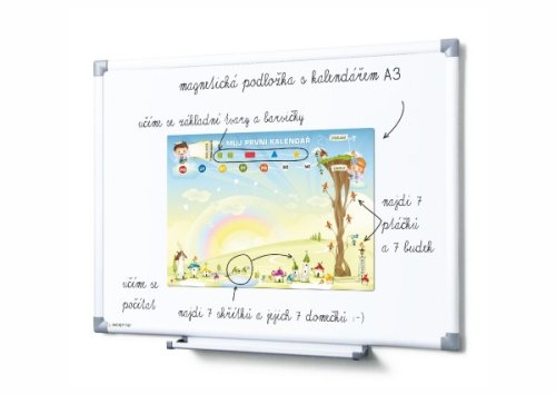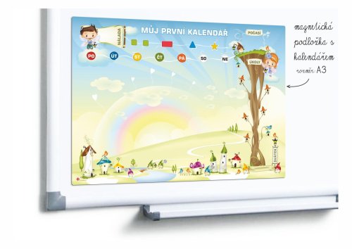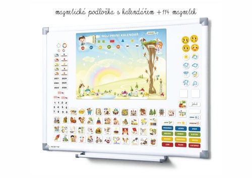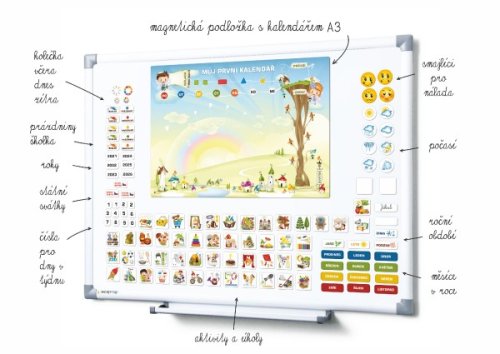 Originální magnetický kalendář pro děti, které si rády hrají s magnetkami. Kalendář má magnetickou podložku o rozměru 420 x 297 mm, která se "přichytne" např. na ledničku (nebo na plechovou tabuli) a 114 magnetek, které si děti přikládají na podložku. Děti se zábavnou formou učí: plánovat své oblíbené činnosti, úkoly - určovat roční období, měsíce, dny v týdnu nebo počasí - poznávat barvičky, základní tvary - hodnotit svou náladu a spoustu další zábavy. Všechny magnetky mají zaoblené rohy pro snadnější odebírání a přesun magnetek v malých ručičkách. Na magnetky lze psát mazacím fixem. Seznam magnetek (114 ks)