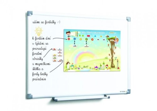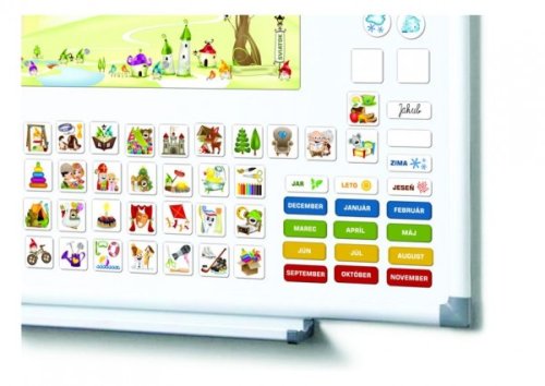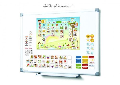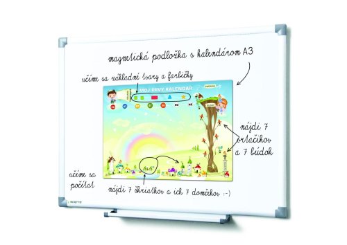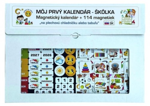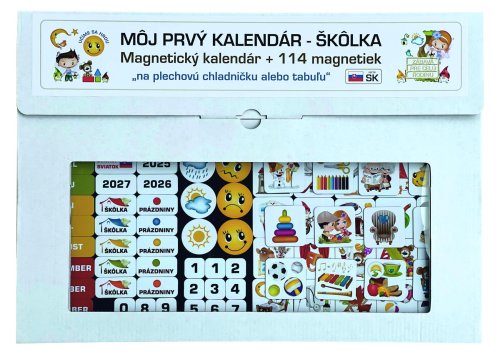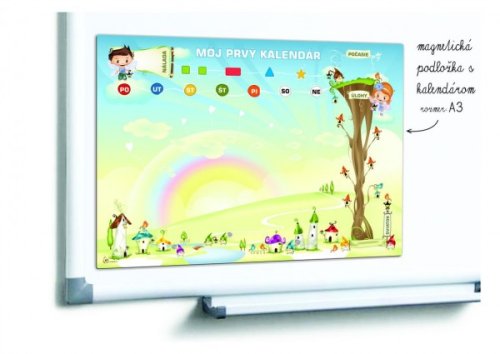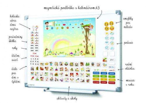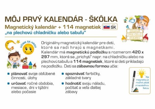 Originálny magnetický kalendár pre deti, ktoré sa radi hrajú s magnetkami. Kalendár má magnetickú podložku s rozmerom 420 x 297 mm, ktorá sa "prichytí" napr. na chladničku alebo na plechovú tabul´u a 114 magnetiek, ktoré si děti prikladajú na podložku. Deti sa zábavnou formou učia:
