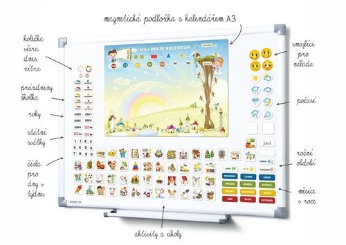 Kdy budou prázdniny? Kdy pojedeme na kolo? Kdy půjdeme nakupovat? Naučte děti plánovat jejich oblíbené činnosti díky magnetickému kalendáři Školka. Magnetická podložka, kterou lze umístit na jakýkoliv kovový povrch například na lednici či tabuli, čeká na plánování těch nejlepších aktivit podle ročních období. Děti se zábavnou formou učí čísla, barvy, názvy měsíců, dny v týdnu, tvary. Mohou si zaznačit, jaké bylo počasí nebo jak se jim jejich den líbil. Na podložku děti mohou umístit až 114 různých magnetek, které mají zaoblené rohy. Na magnetky lze také psát mazacím fixem. Magnetický kalendář Školka je určen pro děti od 3 let. Klíčové vlastnosti magnetického kalendáře Školka Děti se naučí plánovat své povinnosti či oblíbené činnosti Magnetická podložka, kterou lze umístit na jakýkoliv kovový povrch Děti se zábavnou formou učí čísla, barvy, názvy měsíců, dny v týdnu, tvary Celkem 114 různých magnetek, které mají zaoblené rohy Na magnetky lze také psát mazacím fixem Magnetický kalendář Školka je určen pro děti od 3 let Obsah balení: 12 × čísla pro složení data (20 × 20 mm) 12 × měsíce v roce (55 × 20 mm) 4 × roční období (55 × 20 mm) 50 × aktivity, úkoly (40 × 40 mm) 4 × smajlík (kolečko s průměrem 35 mm) 8 × počasí (kolečko s průměrem 35 mm) 1 × dnes (kolečko s průměrem 25 mm) 1 × svátek (55 × 20 mm) 1 × včera (kroužek s průměrem 25 mm) 5 × školka (40 × 20 mm) 5 × prázdniny (40 × 20 mm) 3 × státní svátek 5 × roky (40 × 20 mm) 2 × bílá pro vlastní nakreslení (40 × 40 mm) Vhodné od 3 let