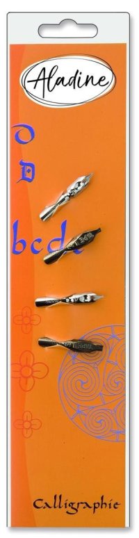 Náhradní perka na kaligrafii, sada 4 ks. Každé perko nich vyžaduje jiné používání a vytváří jiný efekt. Perko nasadíte do násadky (balení násadku neobsahuje). Tip: Namočte perko do inkoustu Aladine, když se hrot rovnoměrně potáhne inkoustem, můžete začít psát Používejte vždy kvalitní papíry vyšší gramáže.