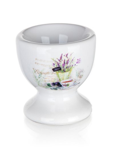 Kalíšek na vajíčko LAVENDER v bílé glazuře s dekorem levandule je vyrobený z keramiky.