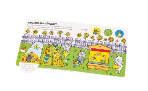 Oblíbený formát leporela s odklápěcími chlopněmi a posuvnými dvířky poskytuje malým čtenářům chytrou zábavu a zároveň utváří jejich představu o tom, jak to vypadá na hospodářském dvoře a co všechno se tam může dít. Práce s takovouto knihou přispívá rovněž ke zlepšování koordinace ruka – oko. Děti tu objevují zvířátka ukrytá ve stodole, na pastvině, na dvorečku, na zahrádce či v polích a řeší jednoduché úkoly zaměřené na rozvoj pozornosti a základních matematických představ.