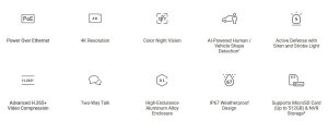 Umělá inteligence rozpozná lidské postavy a vozidla a omezí tak falešné poplachy. Aktivní obrana s zvukovým alarmem a světelným výstražným signálem odradí vetřelce dříve, než se přiblíží. Díky obousměrnému audiosystému můžete s návštěvníky komunikovat i na dálku.