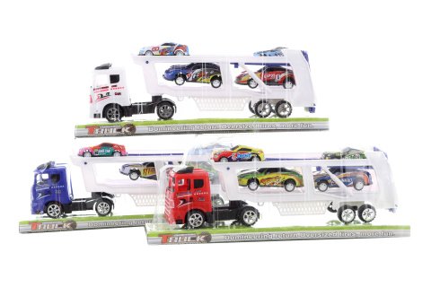 Kamion přepravující 4 závodní auta na setrvačník. Materiál plast. Rozměry balení cca 32x7x13 cm. Věk 3+