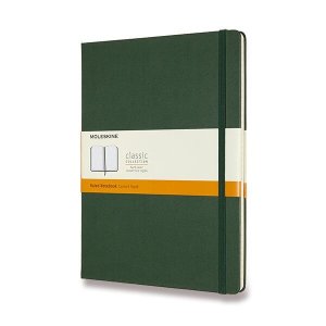 Zápisník s pevnou, ve hřbetu šitou vazbou v kartonových deskách, obepnutý pružnou páskou proti samovolnému otevírání.