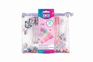 12 krásných gelových per uložené v průhledném pouzdru s přesýpajícími se glitry.