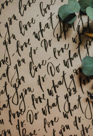Be Nice EKO balicí papír písmo s citátem "do what you love - love what you do" na hnědém papíru.