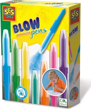Velká sada foukacích fixů obsahuje lepenkový podstavec a držák na fixy, 12 barevných fixů, 8 šablon, 6 papírů a nástavec na foukání s pumpičkou.