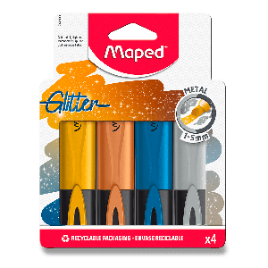 Plochý zvýrazňovač Maped Fluo Peps Glitter Metal ve čtyřech metalických barvách se třpytivými efekty.