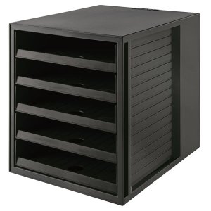 Zásuvkový box KARMA s 5 zásuvkami na papír formátu DIN A4 a větší oceněný ekologickým certifikátem "BLUE ANGEL" Zásuvky mají zarážku proti vytažení a otvor s rukojetí pro snadné vyjmutí Vnější výška …