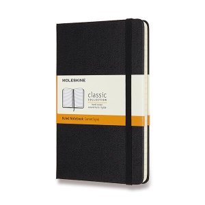 Zápisník s pevnou, ve hřbetu šitou vazbou v kartonových deskách, obepnutý pružnou páskou proti samovolnému otevírání.