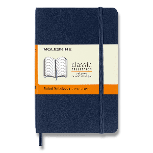 Zápisník s měkkou, ve hřbetu šitou vazbou v kartonových deskách, obepnutý pružnou páskou proti samovolnému otevírání.