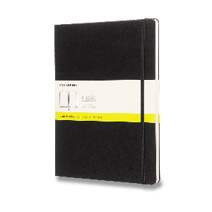 Zápisník s pevnou, ve hřbetu šitou vazbou v kartonových deskách, obepnutý pružnou páskou proti samovolnému otevírání.