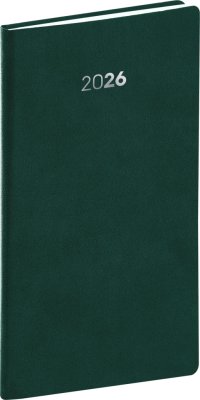 Plánovací kapesní diář Balakon 2026 v zeleném provedení, doplněný o stříbrný letopočet.