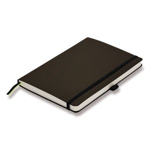 Zápisník s měkkou, v horním hřbetu šitou vazbou v kartonových deskách, obepnutý pružnou páskou proti samovolnému otevírání.
