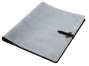 Zápisník s měkkou, ve hřbetu šitou vazbou v kartonových deskách, obepnutý pružnou páskou proti samovolnému otevírání.