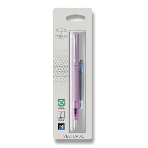Plnicí pero Parker Vector XL s mosazným tělem a víčkem se saténovým metalickým lakem v azurově zelené barvě a v kombinaci s chromovými doplňky. Úchopová část pera je transparentní.