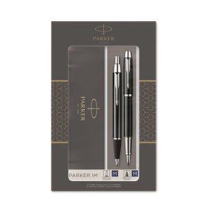 Dárková sada Parker IM plnicí pero + kuličkové pero Řada Parker IM přináší kuličkové a plnicí pero s elegantním kovovým tělem a jednoduchým designem Kuličkové pero má lesklý černý lak a chromové doplňky …