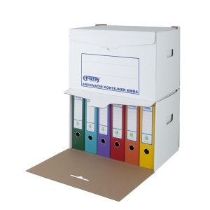 Stohovatelný, uzavíratelný box Pojme až 6 ks pořadačů šíře 8,0 cm Vysoce kvalitní vlnitá lepenka Konstrukce boxu jej předurčuje ke stohování a vytváření stěn z kontejnerů Přední (boční) odklápěcí strana …