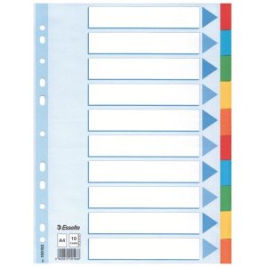 Bílý s šedými okraji a čísly Materiál polypropylen Počet děr: 11 Formát A4 Rejstřík: 1-10 Rozměry: 22,5 x 29,7 cm