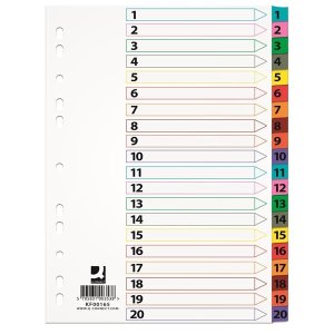Papírové rozlišovače, vhodné pro organizaci a kategorizaci dokumentů v pořadači Počet kusů v balení: 20 (číslováno 1 - 20), barevné (2 x 10 barev) Počet děr: 11 Tloušťka materálu: 170g Formát: A4