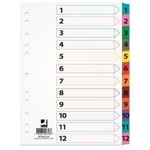 Plastové rozlišovače ideální pro organizaci a kategorizaci dokumentů v pořadači Materiál: PP Tloušťka materiálu: 125 mic Počet kusů v sadě: 12 ks (v přehledu číslováno 1 - 12) Univerzální multiperforace …