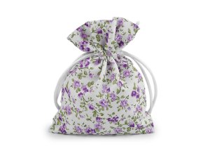 Textilní dárkový pytlík s drobnými květy působí romantickým dojmem.