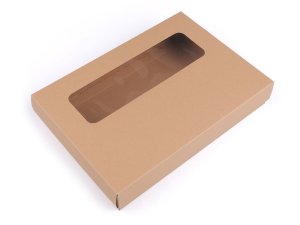Papírová krabice má obdélníkový výřez ve víku z průhledné fólie.