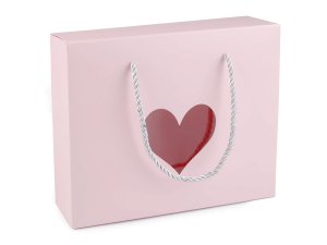 Papírová krabice s průhledem srdce má ucha z lesklé kroucené šňůry.