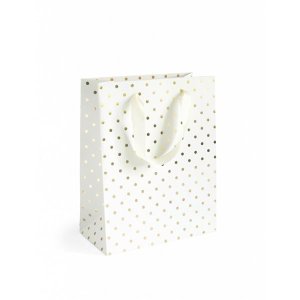 Papírová dekorativní dárková taška, rychlý pomocník při balení vašich dárků Rozměry: velikost M - 25 x 10 x 20 cm Barva: bílá Motiv: zlaté metalické puntíky Počet ks v balení: 5 ks