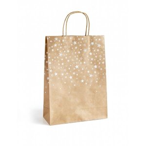 Papírová dekorativní dárková taška z kraftového papíru, rychlý pomocník při balení vašich dárků Rozměry: velikost L - 33 x 10 x 24 cm Barva: tmavě béžová Motiv: bílé hvězdy Počet ks v balení: 5 ks