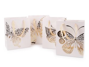 Dárková taška s motivem motýla je vyrobená z kvalitního pevného křídového papíru.