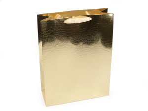 Dárková taška s efektním metalickým povrchem se strukturou krokodýlí kůže se hodí na luxusní zabalení velkého dárku.
