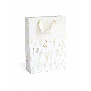 Papírová dekorativní dárková taška, rychlý pomocník při balení vašich dárků Rozměry: velikost L - 33 x 10 x 24 cm Barva: bílá Motiv: zlaté metalické květiny Počet ks v balení: 5 ks