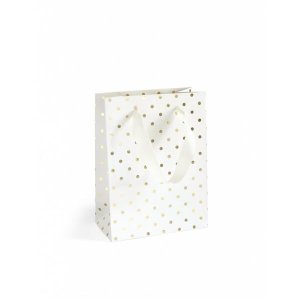 Papírová dekorativní dárková taška, rychlý pomocník při balení vašich dárků Rozměry: velikost S - 20 x 8 x 15 cm Barva: bílá Motiv: zlaté metalické puntíky Počet ks v balení: 5 ks
