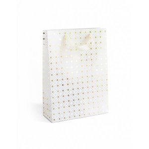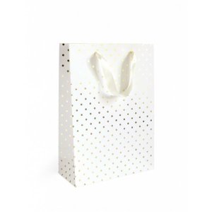 Papírová dekorativní dárková taška, rychlý pomocník při balení vašich dárků Rozměry: velikost L - 33 x 10 x 24 cm Barva: bílá Motiv: zlaté metalické puntíky Počet ks v balení: 5 ks