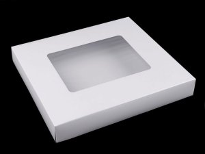 Obdélníková papírová krabice má výřez ve víku z průhledné fólie. [Povrch bílé krabice je lesklý].