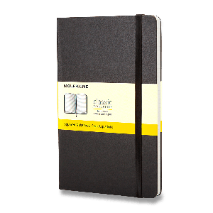 Linkovaný notes v pevných deskách s uzavíráním na gumičku, kapsou na drobnosti a poutkem na tužku. 172 stran na žlutém papíře.