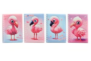 Zápisník s kroužkovou vazbou a motivem plameňáka.