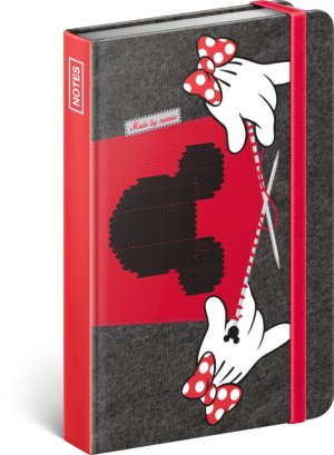 Zápisník s pevnou, ve hřbetu šitou vazbou v kartonových deskách, obepnutý pružnou páskou proti samovolnému otevírání.