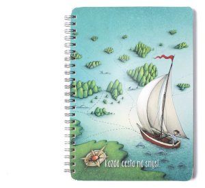 Více stran pro delší příběhy. ,Zápisník s pevnou, ve hřbetu šitou vazbou v kartonových deskách, obepnutý pružnou páskou proti samovolnému otevírání.