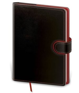 Zápisník s měkkou, ve hřbetu šitou vazbou v kartonových deskách, obepnutý pružnou páskou proti samovolnému otevírání.