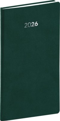 Plánovací kapesní diář Balakon 2026 v zeleném provedení, doplněný o stříbrný letopočet.