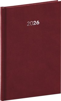 Plánovací týdenní diář Balakon 2026 v provedení bordó, doplněný o stříbrný letopočet.