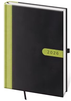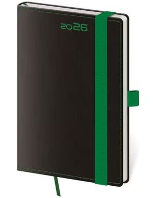 Praktický týdenní diář ve svěže zeleném provedení s kontrastní černou gumičkou a poutkem na pero.