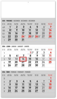Praktický plánovací kalendář s tříměsíčním rozložením a orientační lištou s posuvným jezdcem.