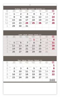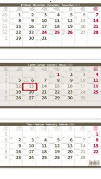 Praktický plánovací kalendář s tříměsíčním rozložením a orientační lištou s posuvným jezdcem.