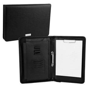 Konferenční deska A4 s vysouvatelnými uchy. -barva černá, ekokůže; Portfolio zahrnuje: čtyř-kroužkový pořadač, 2 kapsy na doklady, dvě menší kapsy, jedna na zip, 2 místa pro pera, kapsa pro mobil,...