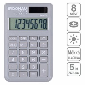 Kapesní kalkulačka s 8místným displejem, vhodná do školy nebo kanceláře.